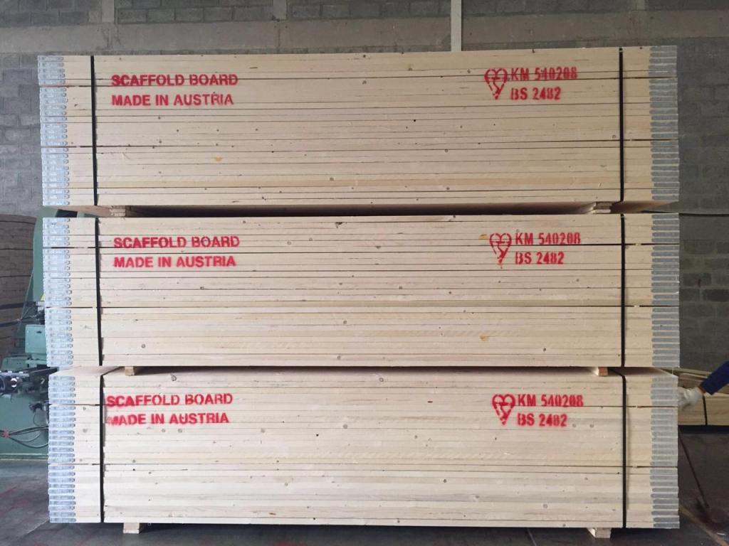 Scaffolding boards with metal edge bands ensure a tight and secure fit in the scaffolding poles. Construction workers depend on it for safety on their working platforms. This should never be compromised. British Standard BS2482 describes the specifications and grading process for the production of the boards, leading to certification. Companies producing and supplying the certified boards must be accredited by BMTRADA.